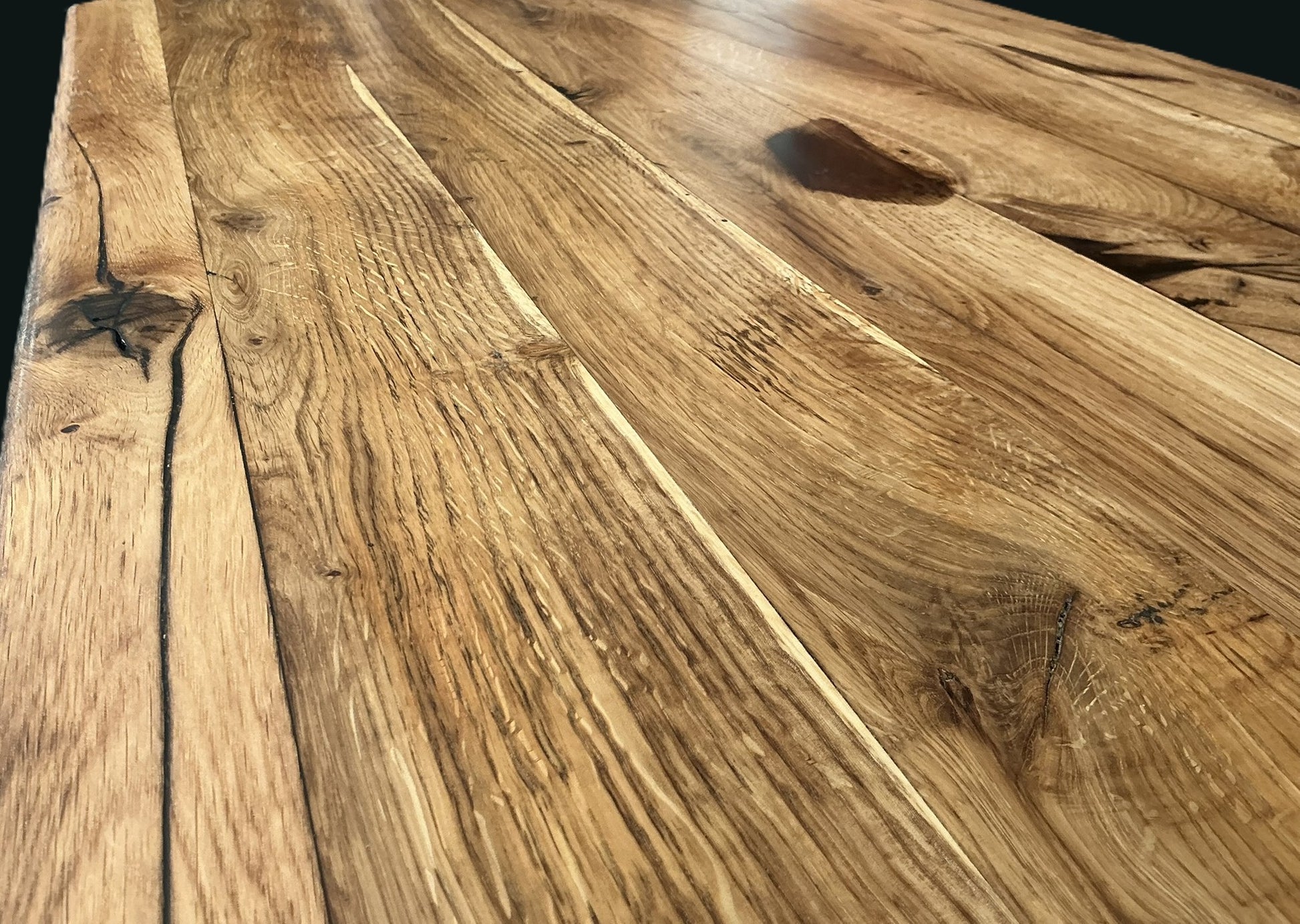 Blad: Massief eikenhout, ±6 cm dik, samengesteld uit oude balken